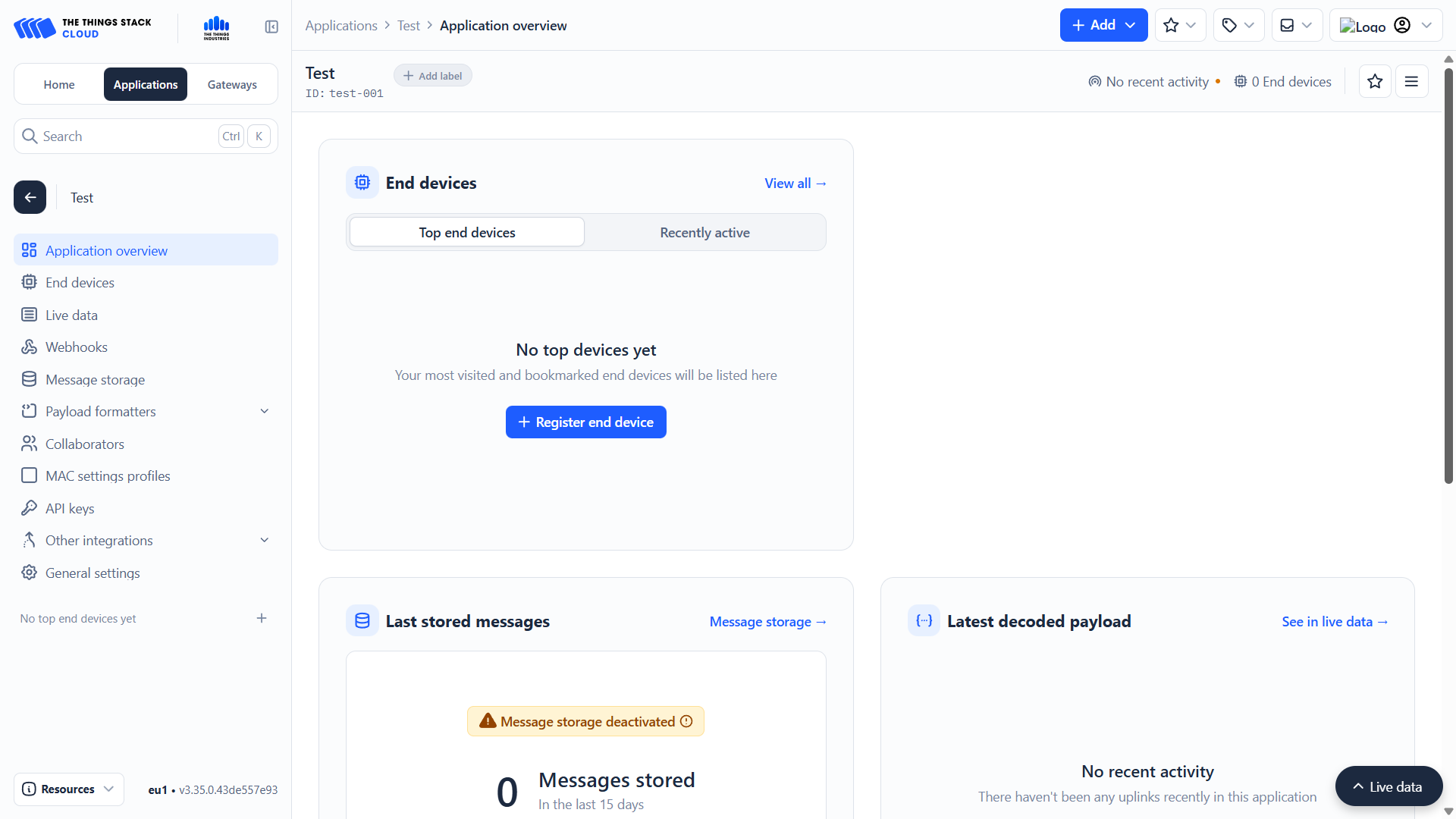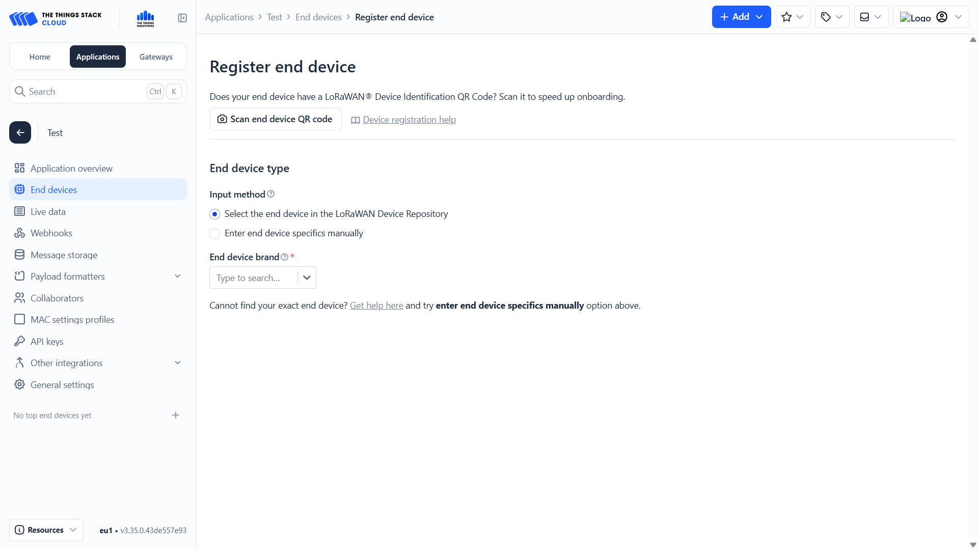 - Alternatively, click + Add and choose Register end device in an application.
