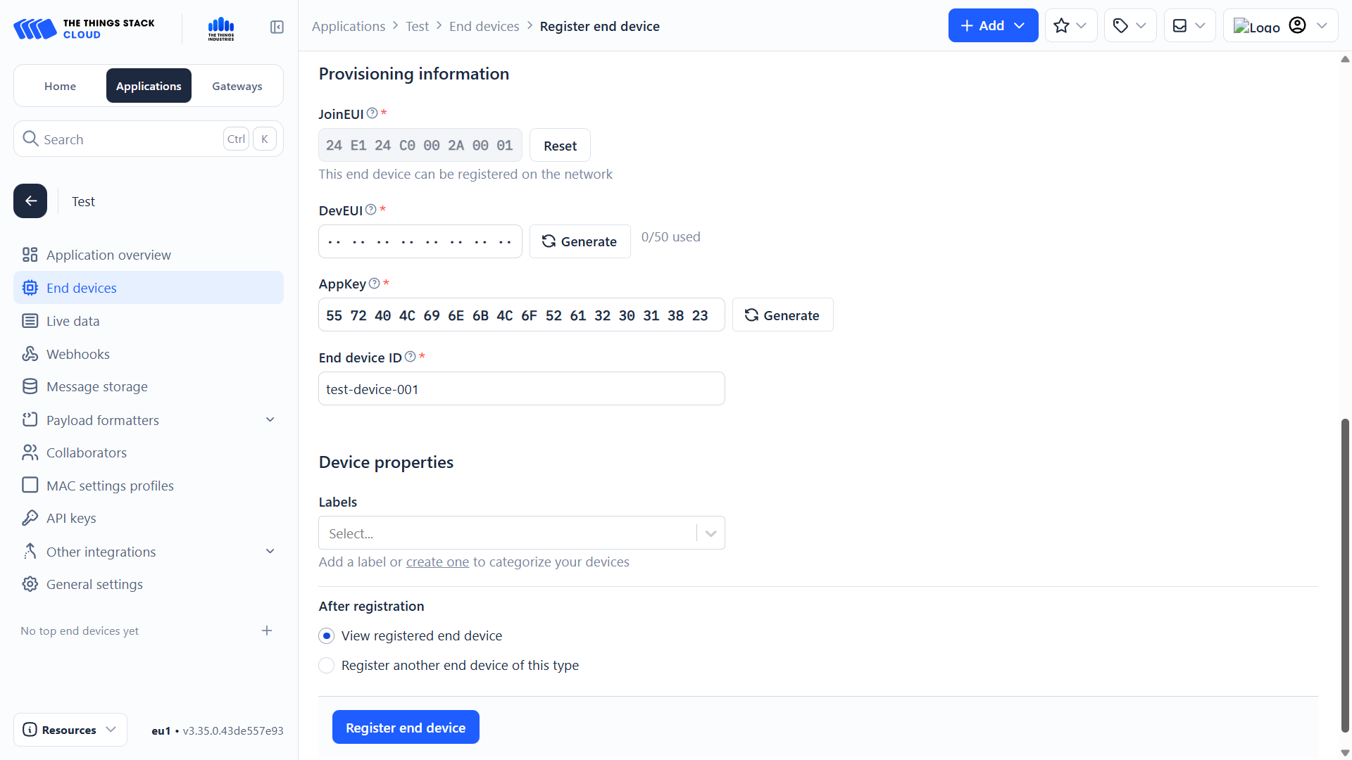 Click the blue Register end device button.