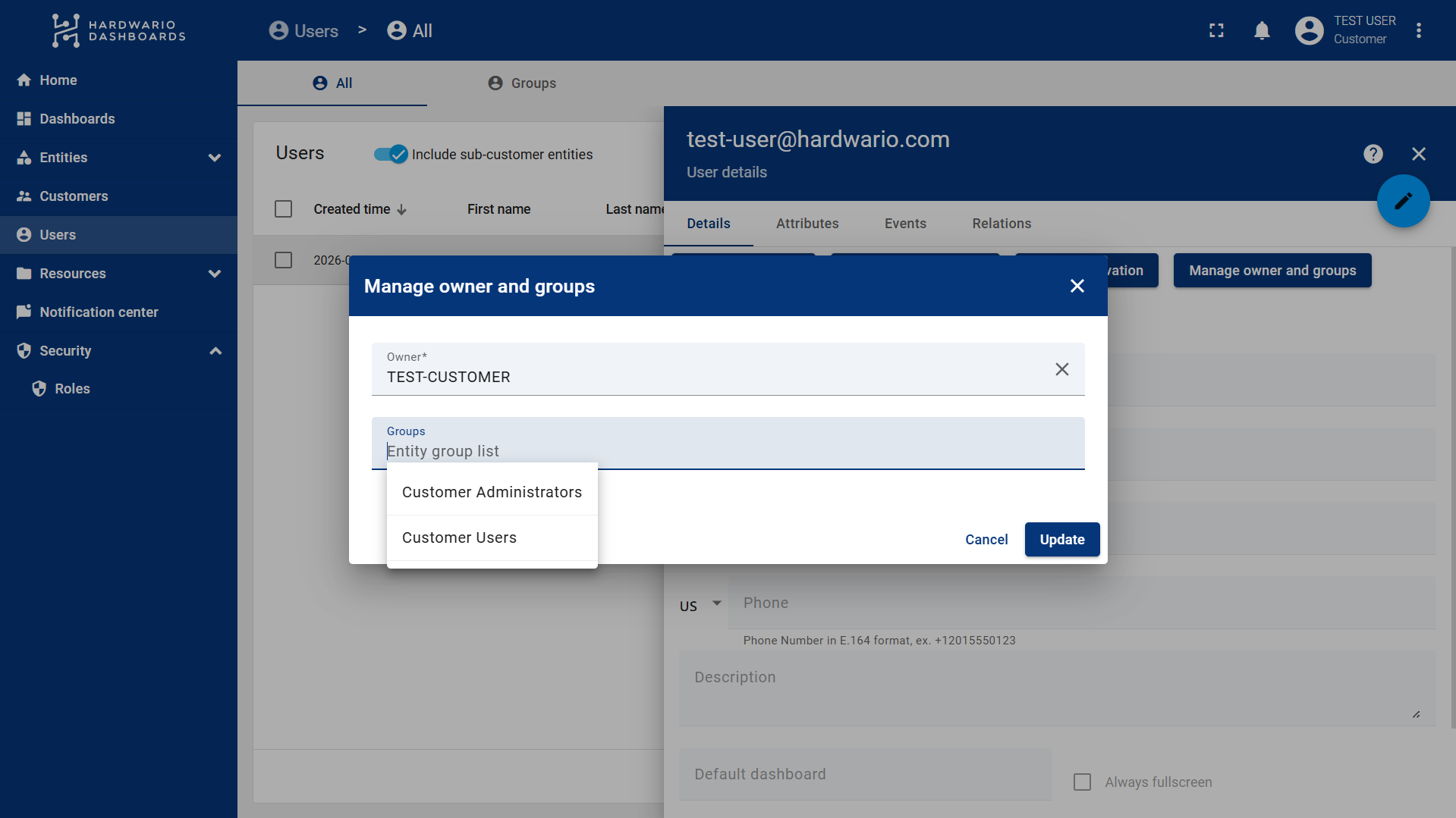 Follow these steps to assign Groups and manage user permissions in ThingsBoard: