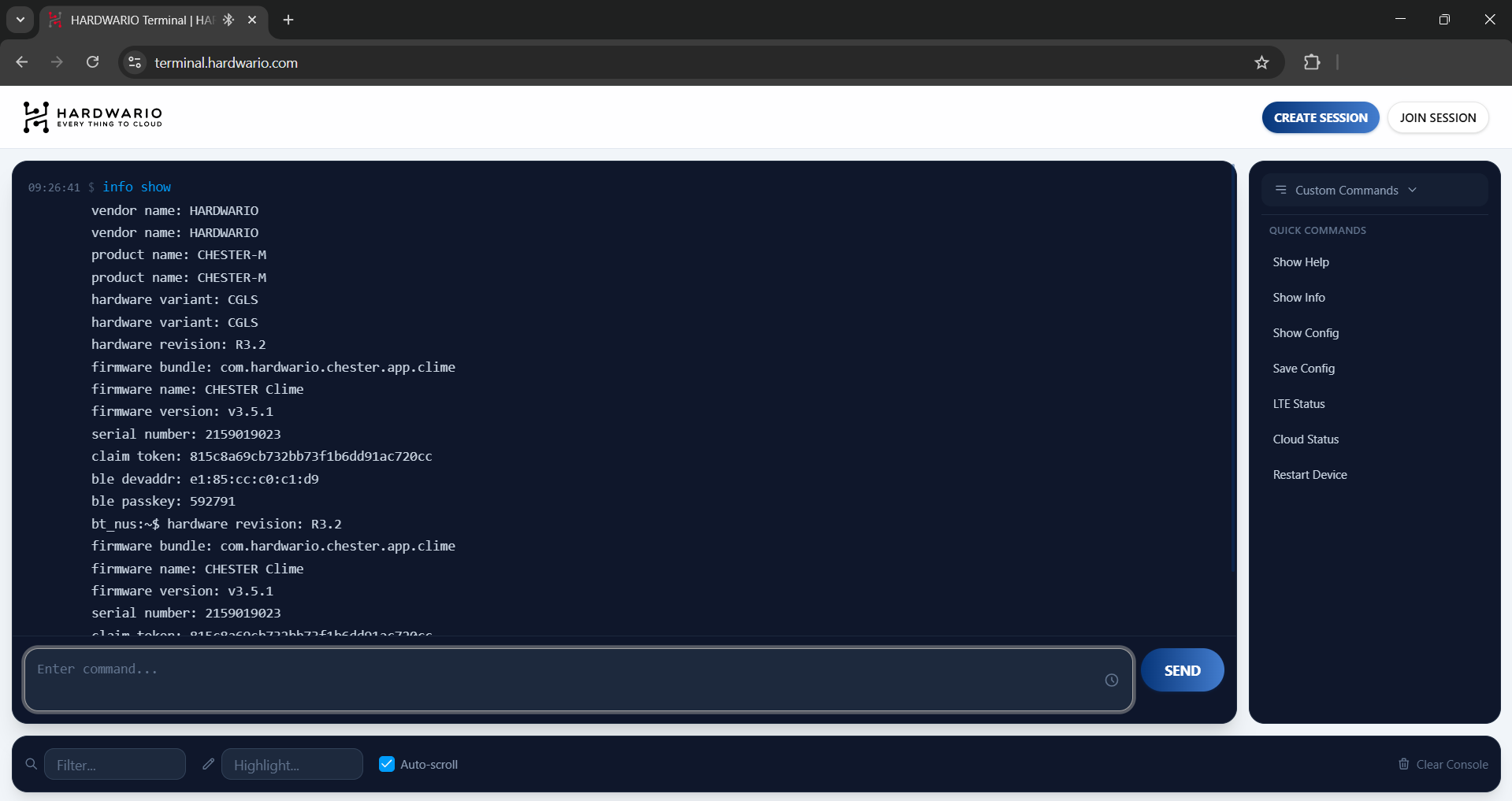 A major advantage of the HARDWARIO Terminal App is the Remote Session feature. This allows you to grant access to your device to someone far away (such as HARDWARIO Support) without them needing a direct Bluetooth connection. Only you need to be physically connected via Bluetooth; you can then share a Session ID to let them control the CHESTER remotely.