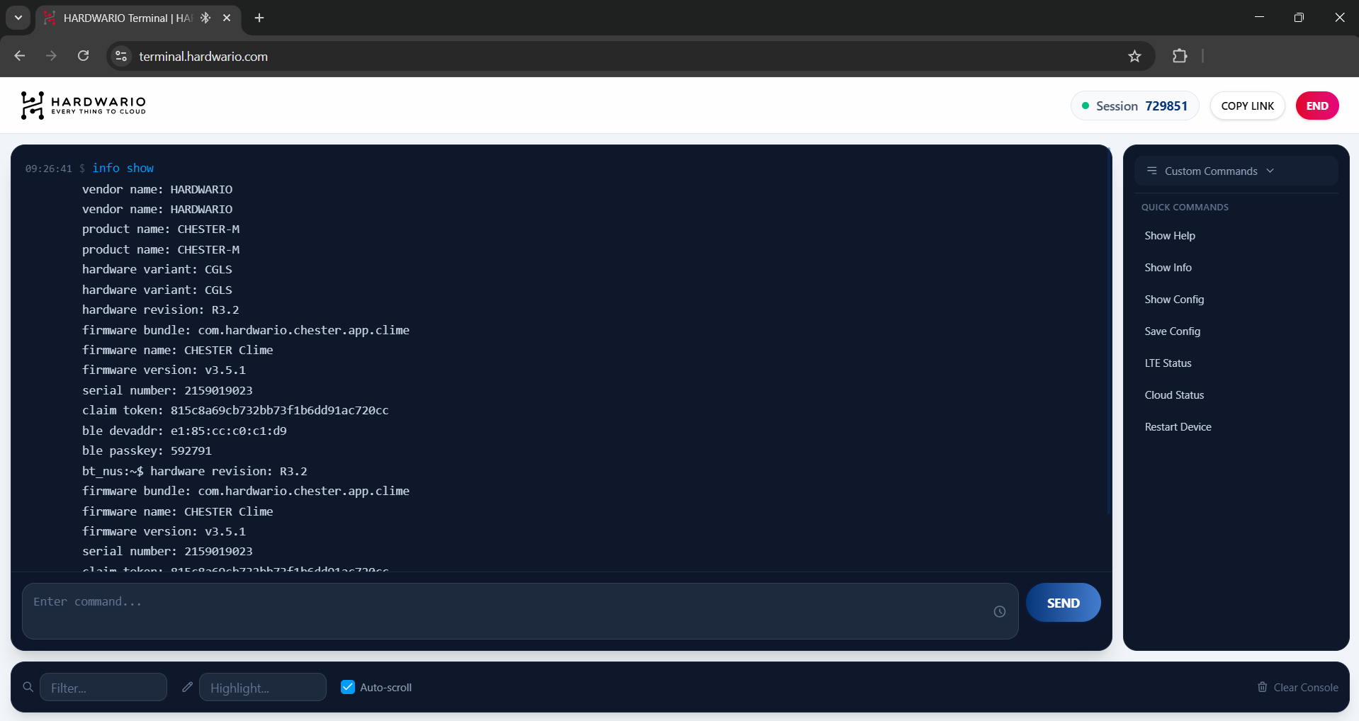 info showcommand in the terminal (via the HARDWARIO Manager Mobile App, the HARDWARIO Monitor PC app, or from a previous session in this web terminal).